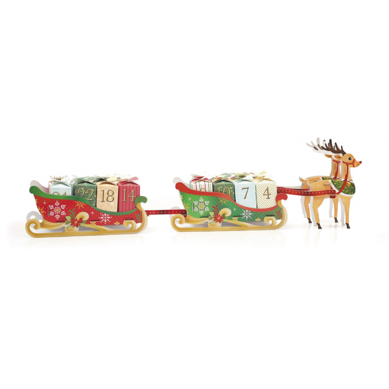 Kit permettant de confectionner soi-même son calendrier de l’Avent en carton représentant des rennes tirant deux traineaux à remplir de surprises!