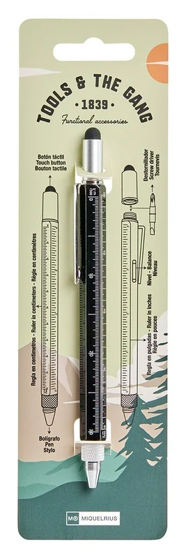 Outre le stylo, il comprend une règle en centimètres et en pouces, un niveau à bulle, un tournevis plat et cruciforme, ainsi qu’un stylet tactile pour smartphones et tablettes. Recharge bleue, encre à base d’huile pour une glisse fluide sur le papier.
