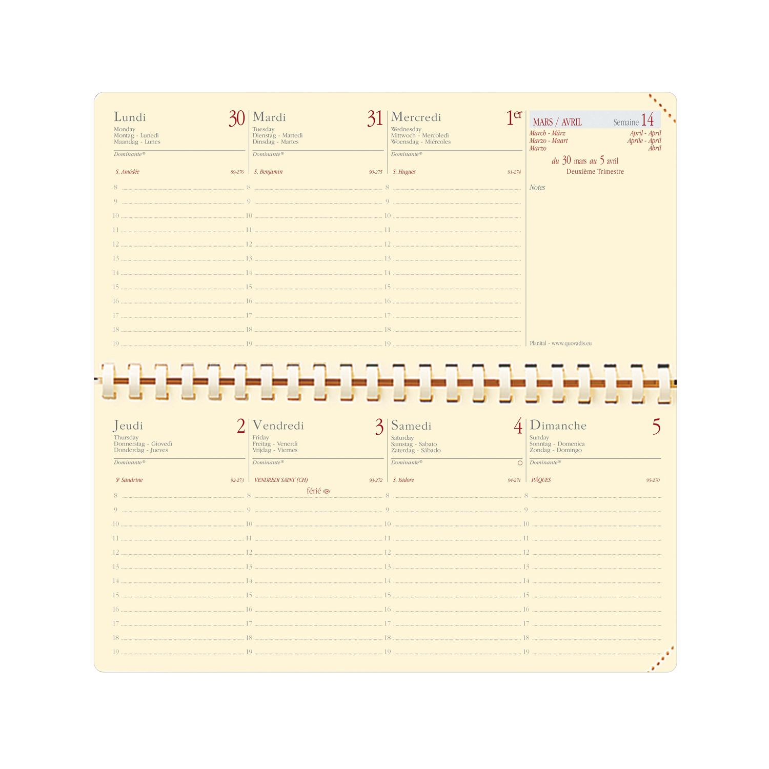 Agenda hebdomadaire s’ouvrant à l’italienne, avec présentation de la semaine sur 2 pages afin d’offrir une vue d’un seul coup d’œil