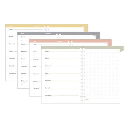 Agenda hebdomadaire avec une présentation de la semaine sur la page de gauche et une page de notes sur la droite pour un usage 2-en-1 agenda/carnet